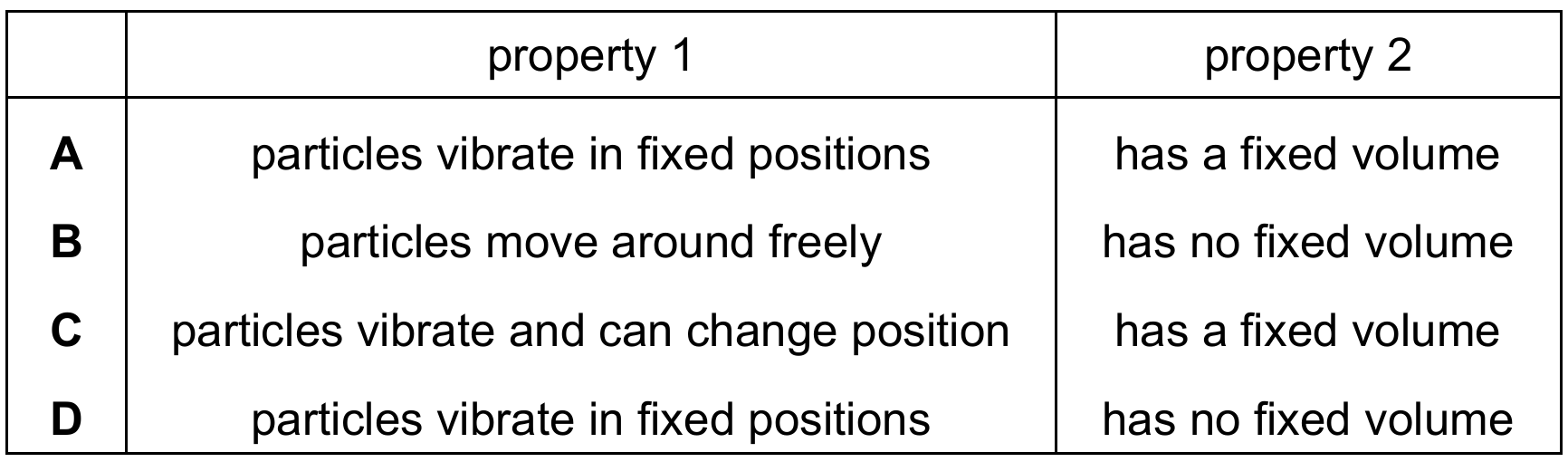 Option D is contradictory because a fixed particle arrangement prevents a substance from having “no fixed volume”.