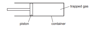 Gas of volume 200 \(cm^3\) is trapped inside a container by a piston. The piston is pushed to the right and the volume of the gas decreases to 100 \(cm^3\). The temperature of the gas remains constant.