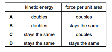 Which row states the effect that this has on the kinetic energy of the gas particles and the force per unit area exerted by the particles colliding with the inside walls of the container?
