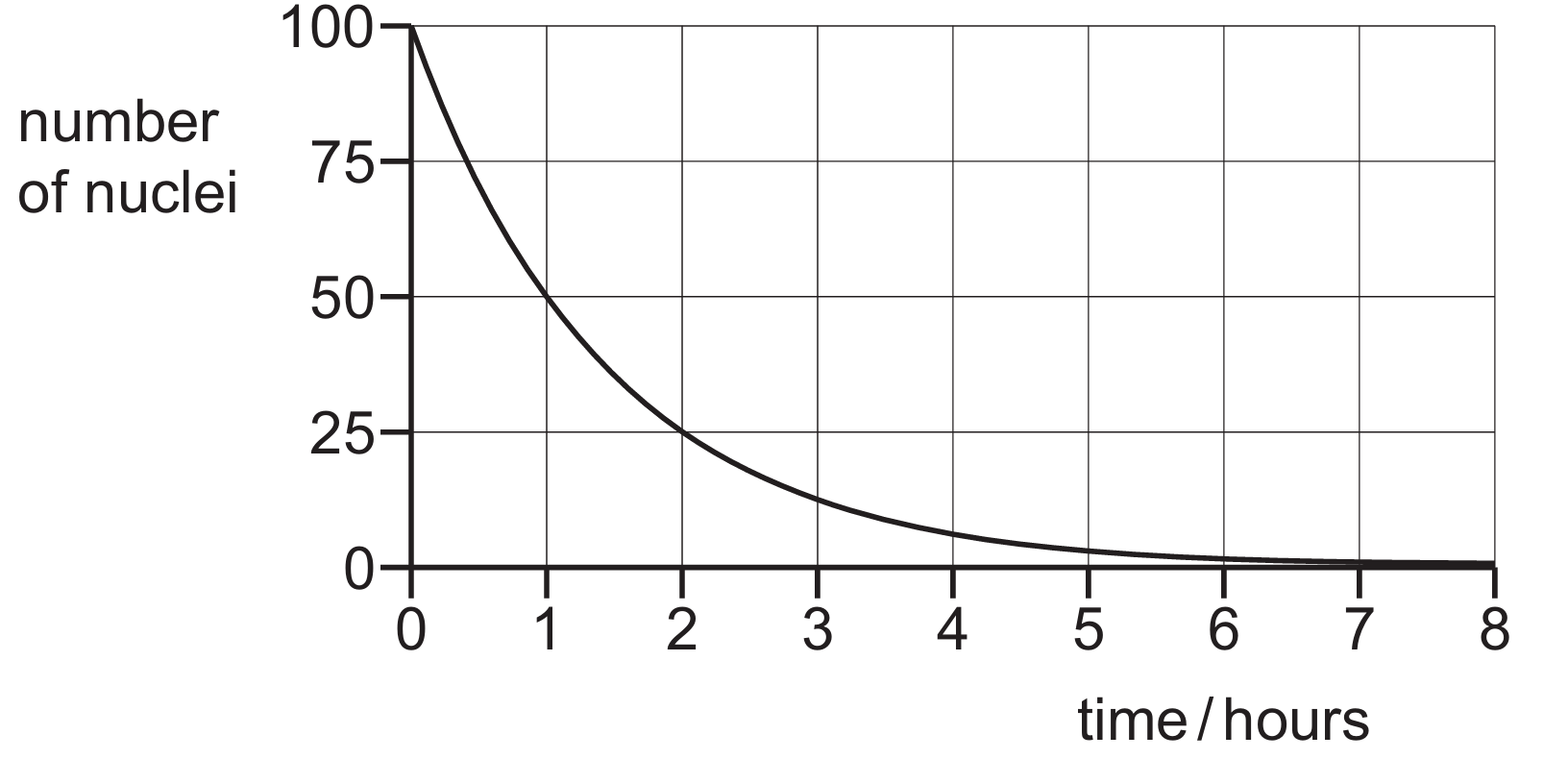 The half-life is defined as the time taken for half the nuclei in a sample to decay. Starting with $100$ nuclei at $t = 0$, half of the initial amount is $\frac{100}{2} = 50$ nuclei. By locating $50$ on the vertical axis (number of nuclei) and moving horizontally to the curve, we drop down to the horizontal axis to find the corresponding time. The graph shows that the sample reaches $50$ nuclei at $t = 1$ hour. Similarly, it takes another hour to halve again to $25$ nuclei at $t = 2$ hours, confirming the half-life is $1$ hour.