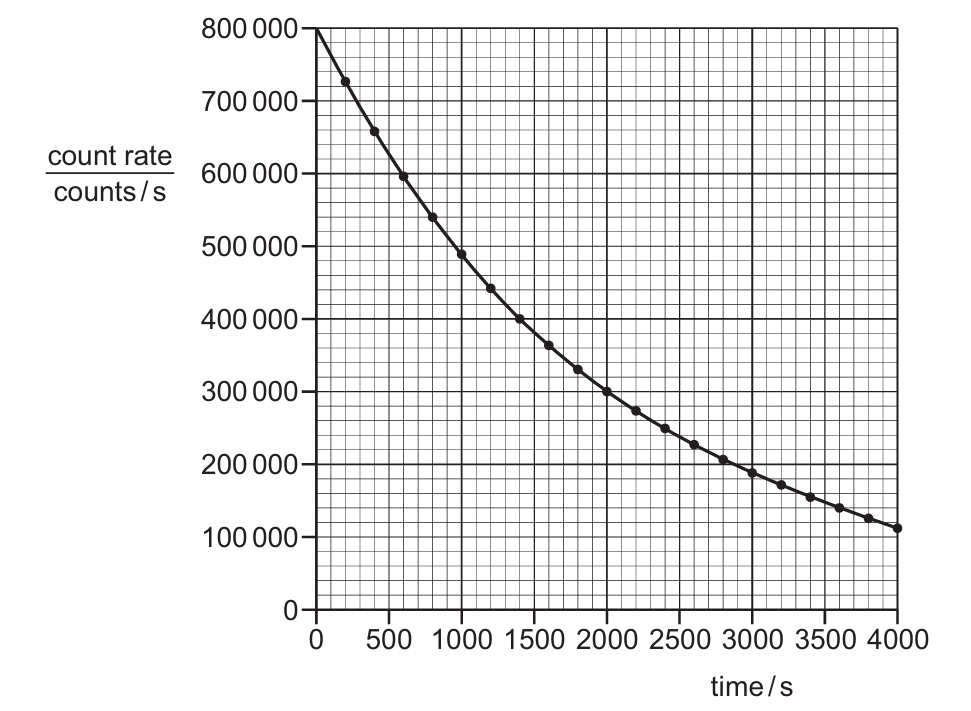 The half-life is the time taken for the activity (count rate) of a radioactive sample to decrease to half of its initial value. From the graph, the initial count rate at $t = 0$ s is $800~000$ counts/s. Half of this initial value is $\frac{800~000}{2} = 400~000$ counts/s. By locating $400~000$ counts/s on the y-axis and moving horizontally to the curve, we drop down to the x-axis to find the corresponding time. The intersection occurs at approximately $1400$ s. Therefore, the approximate half-life is $1400$ s.