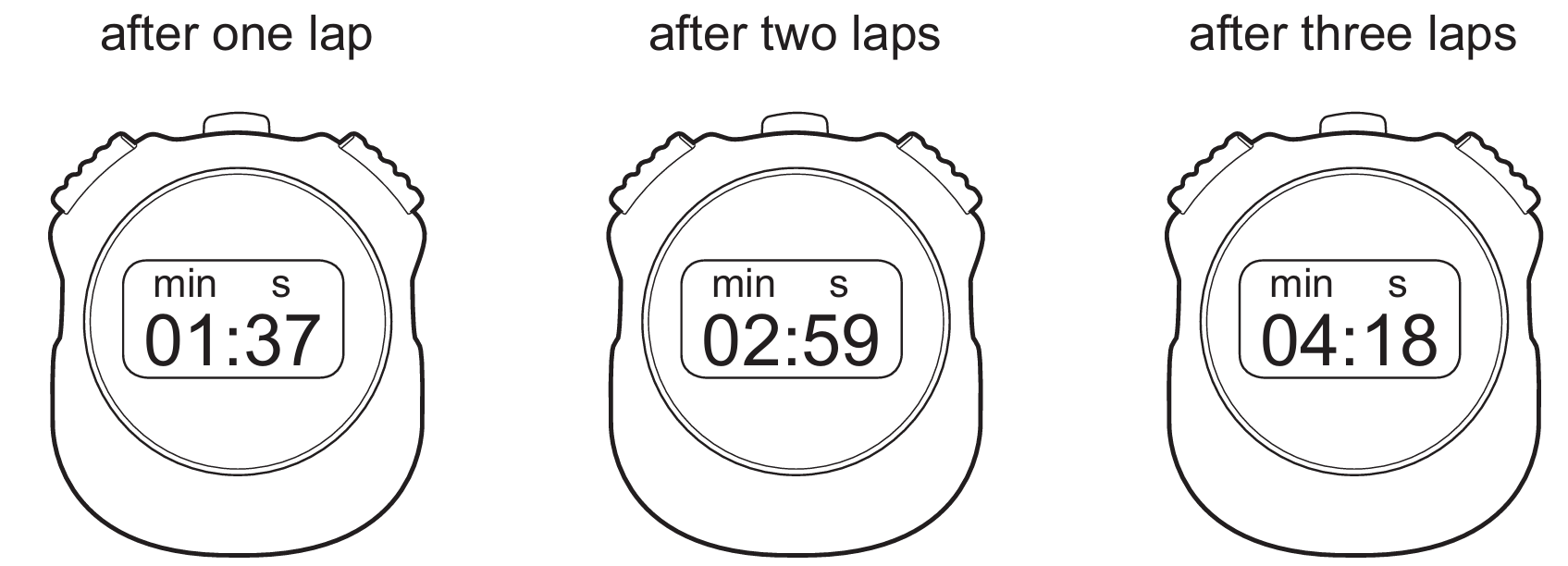 The reading after two laps is $02:59$ ($2\text{ min }59\text{ s}$) and after three laps is $04:18$ ($4\text{ min }18\text{ s}$).