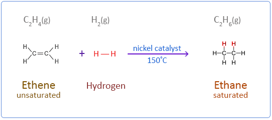 - Equation: \( \text{CH}_2= \text{CH}_2 + \text{H}_2 \rightarrow \text{CH}_3\text{CH}_3 \)