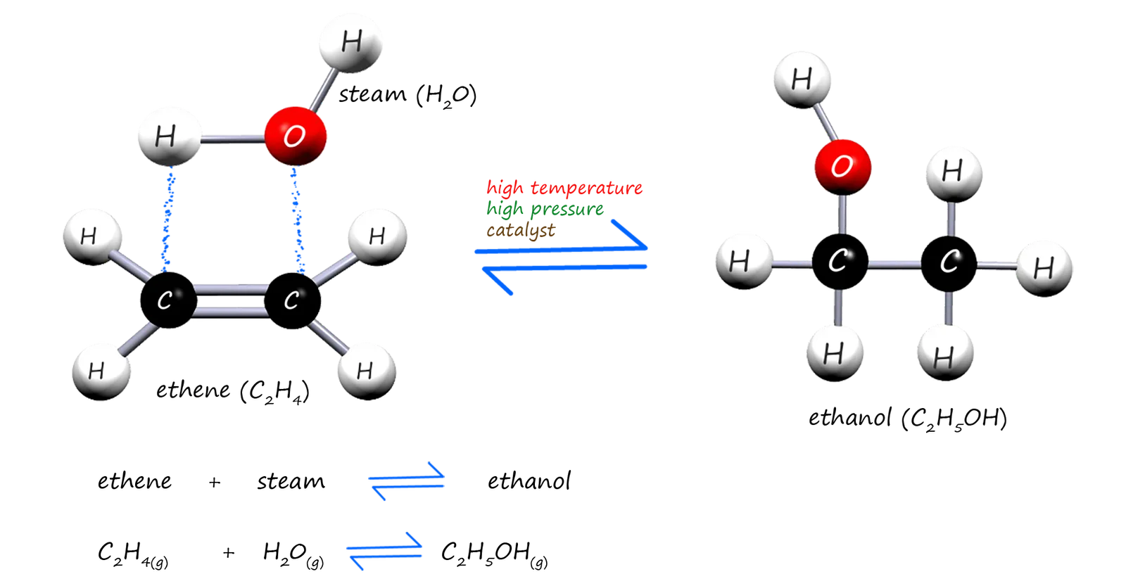 \( \text{CH}_2=\text{CH}_2 + \text{H}_2\text{O} \rightarrow \text{CH}_3\text{CH}_2\text{OH} \)