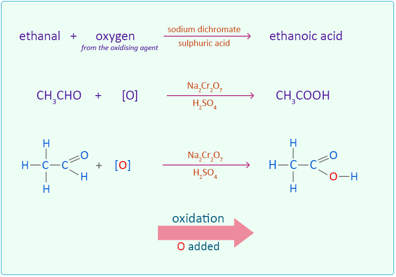 In the presence of oxygen, bacteria such as Acetobacter oxidise ethanol to ethanoic acid. This process occurs naturally when alcoholic drinks like wine are left exposed to air, producing vinegar (a dilute solution of ethanoic acid).
