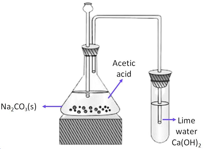 \( 2\text{CH}_3\text{COOH} + \text{Na}_2\text{CO}_3 \rightarrow 2\text{CH}_3\text{COONa} + \text{H}_2\text{O} + \text{CO}_2 \)