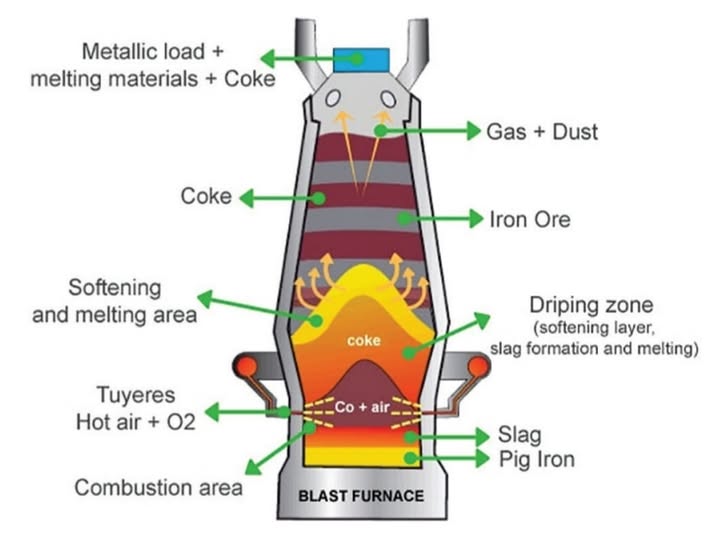 Iron is extracted from its ore, hematite (Fe2O3), in a blast furnace. The process involves several steps, each with a specific function to ensure efficient production of molten iron.