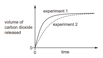 In experiment 1, small lumps of limestone are added to dilute ethanoic acid at 40°C. The volume of carbon dioxide released is measured at regular time intervals. A graph of the results is shown.