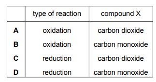 Oxides of nitrogen are produced by car engines. In a catalytic converter oxides of nitrogen are removed by reacting them with compound X. Which row describes the type of reaction oxides of nitrogen undergo and identifies compound X?