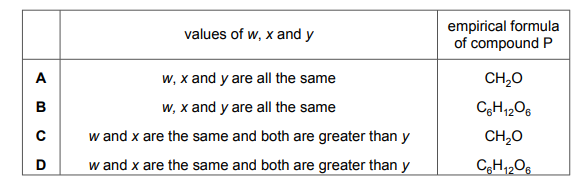 Compound P is a product of the reaction. Which row describes the values of w, x and y and gives the empirical formula of compound P?