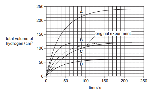The experiment is repeated with \(5 cm^3\) of 0.5 mol / \(dm^3\) sulfuric acid added to \(5 cm^3\) of water using the same mass of magnesium ribbon. Which line on the graph shows the results of the second experiment?