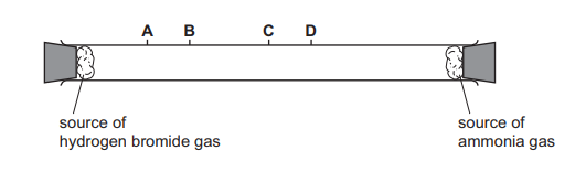 The experiment is repeated using hydrogen bromide gas, HBr, in place of hydrogen chloride. How far along the tube does the white cloud of solid ammonium bromide form?