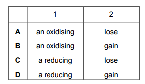 Potassium iodide is …… 1 …… agent in this reaction because iodide ions …… 2 …… electrons.