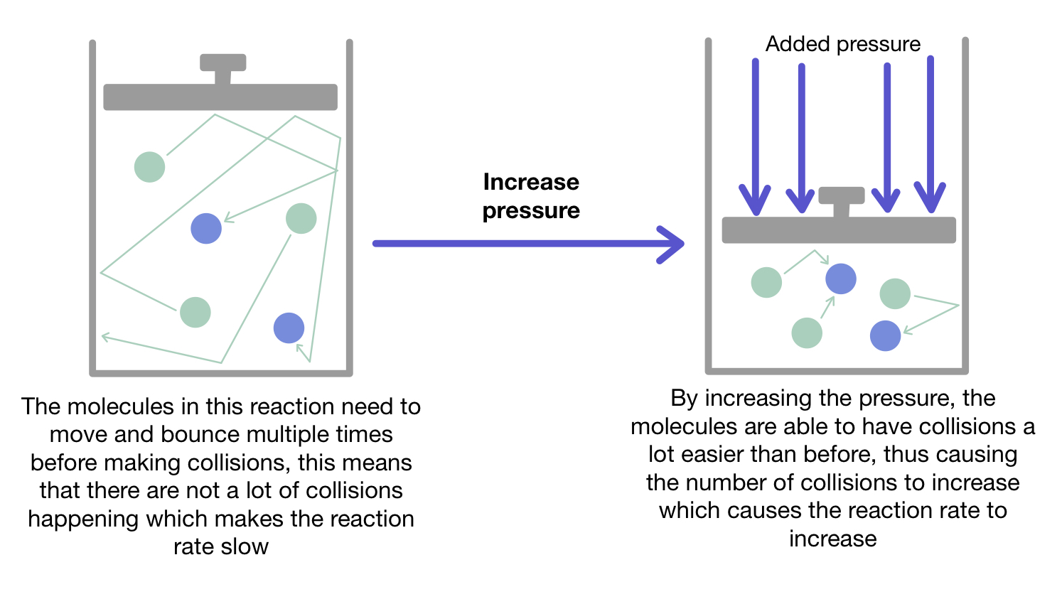 Increasing the pressure of a gas compresses the particles into a smaller volume. This increases the number of gas particles per unit volume, so collisions between particles happen more often, increasing the reaction rate.