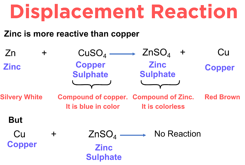 - Displacement reactions – A more reactive metal displaces a less reactive metal from its salt solution. For example, zinc can displace copper from copper sulfate, but copper cannot displace zinc from zinc sulfate. These reactions clearly show which metal is more reactive.