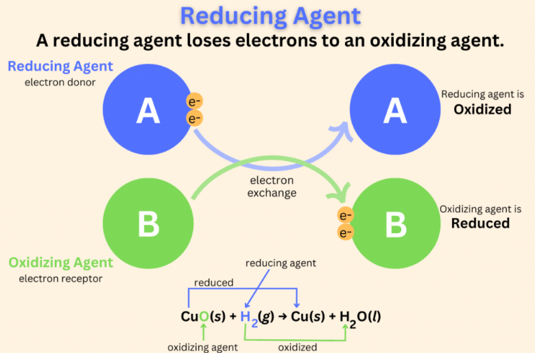 A reducing agent is a substance that causes another substance to be reduced (gain electrons) and in the process, it itself is oxidised (loses electrons).