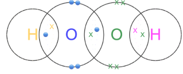 Each oxygen atom forms a single covalent bond with the other oxygen and one with a hydrogen in Hydrogen Peroxide (H2O2). Give dot and cross structure.