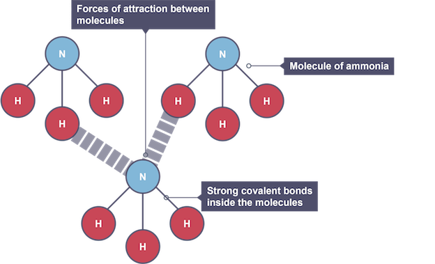 | Low melting and boiling points | The molecules are held together by weak intermolecular forces. These require little energy to overcome, so the substance melts or boils easily. |