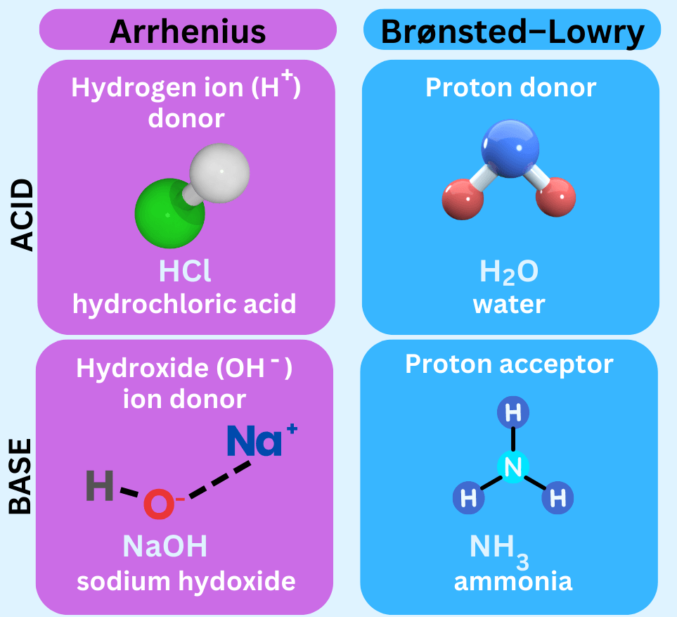 Arrhenius bases must contain \( \text{OH}^- \) in their formula, but \( \text{NH}_3 \) does not. However, in Brønsted–Lowry terms, \( \text{NH}_3 \) is a base because it accepts an \( \text{H}^+ \) from water to form \( \text{NH}_4^+ \) and \( \text{OH}^- \).