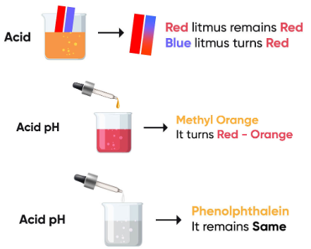 - Litmus: Turns red in acid due to the high concentration of \( \text{H}^+ \) ions.
