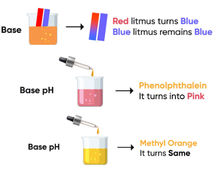 - Litmus: Turns blue because \( \text{OH}^- \) ions shift the indicator to its basic form.