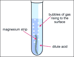 Acids react with reactive metals to produce a salt and hydrogen gas. This reaction is typically faster with more reactive metals such as magnesium and zinc. The hydrogen gas produced can be tested using a lighted splint, which produces a ‘pop’ sound.