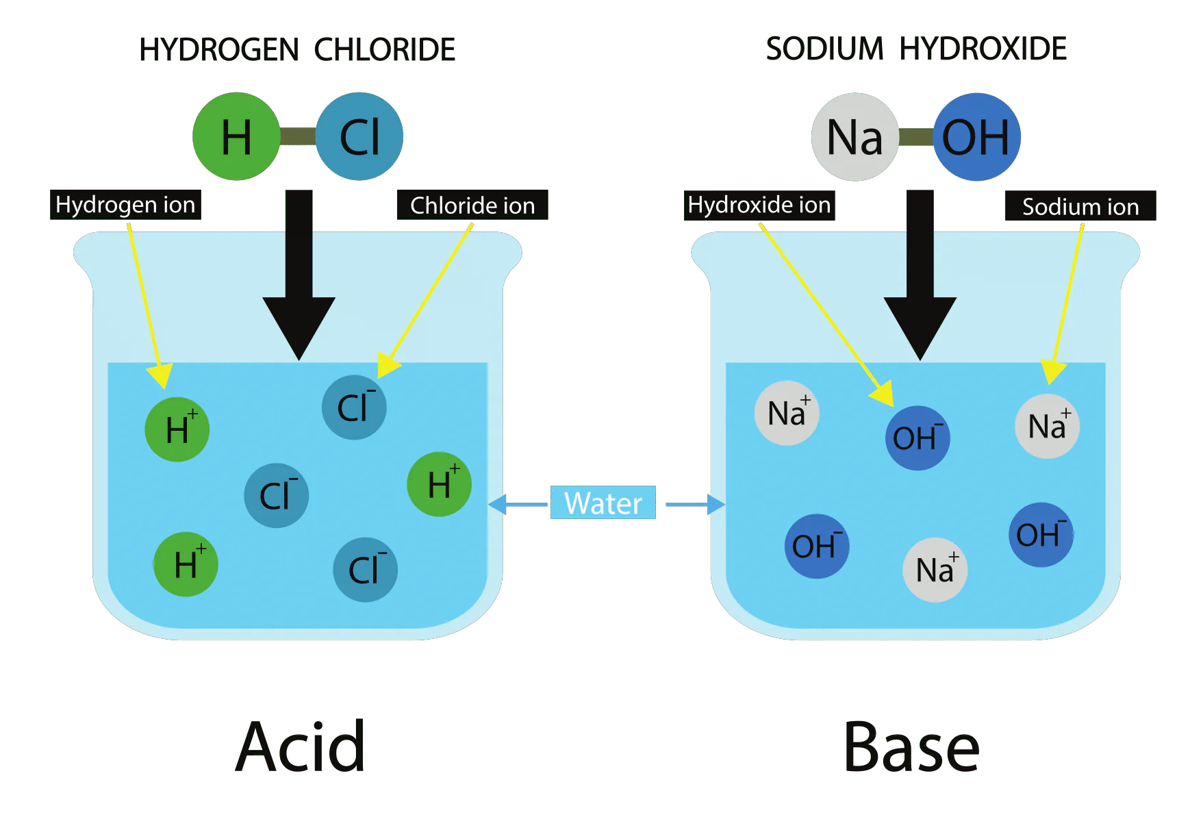 - Example : \( \text{HCl}_{(aq)} \rightarrow \text{H}^+_{(aq)} + \text{Cl}^-_{(aq)} \)