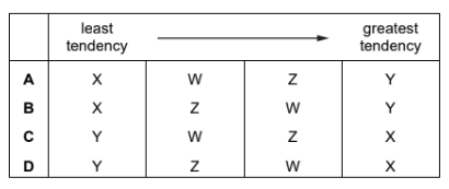 ● Z reacts with aqueous ions of X but not with aqueous ions of Y or W.