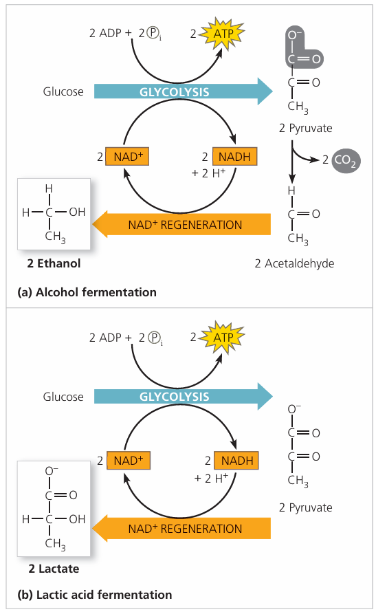 Plants/Yeast: Glucose → ethanol + CO₂ + ATP