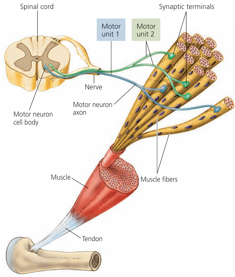 - Ends in axon terminals connecting to muscle/gland.