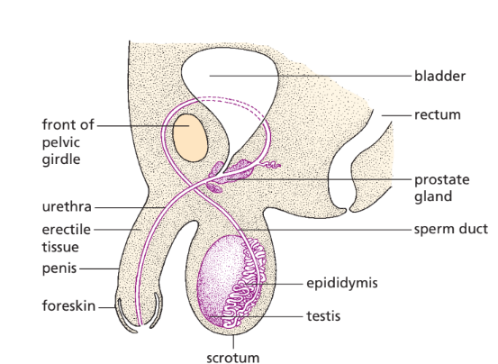 Identify on diagrams and state the functions of the following parts of the male reproductive system: testes, scrotum, sperm ducts, prostate gland, urethra and penis