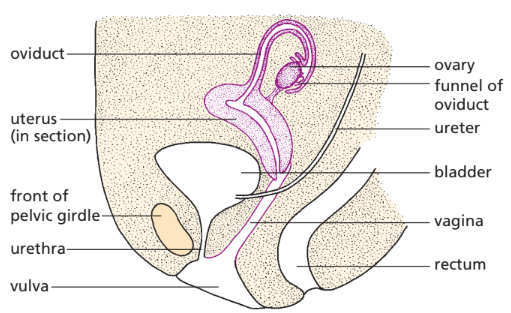 Identify on diagrams and state the functions of the following parts of the female reproductive system: ovaries, oviducts, uterus, cervix and vagina