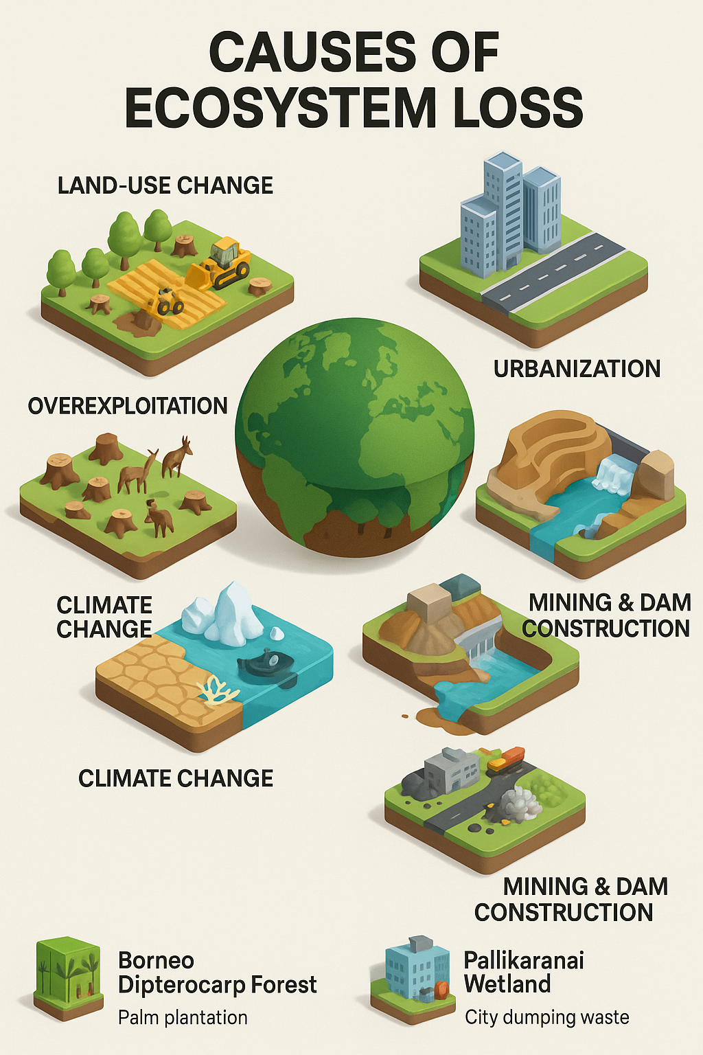 Loss of forests, wetlands, or coral reefs reduces living space and resources.