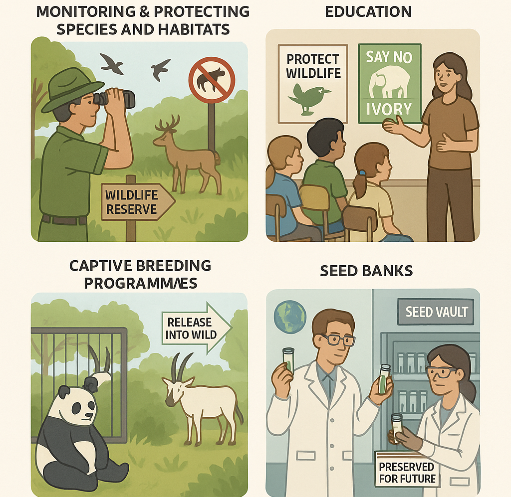 Key methods: monitor & protect, education, captive breeding, seed banks.