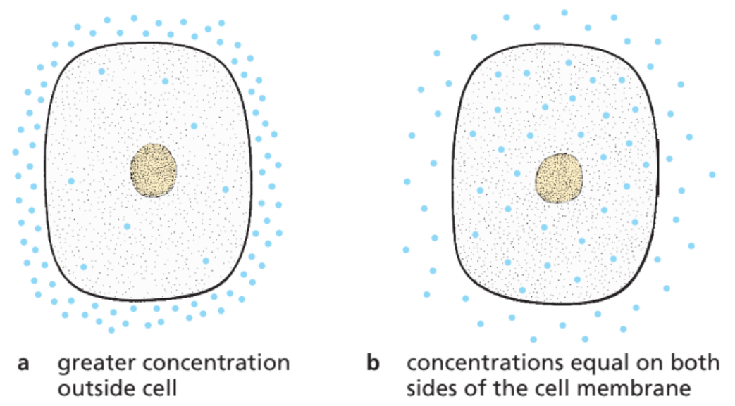 Diffusion = net movement of particles from a region of higher concentration → to a region of lower concentration (down a concentration gradient), due to random movement of particles.
