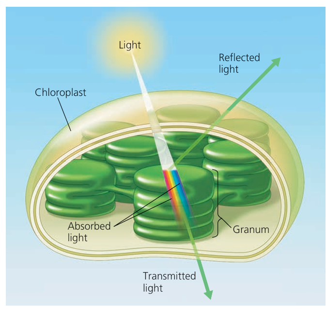 - Chlorophyll (in chloroplasts) absorbs light and converts it into chemical energy.
