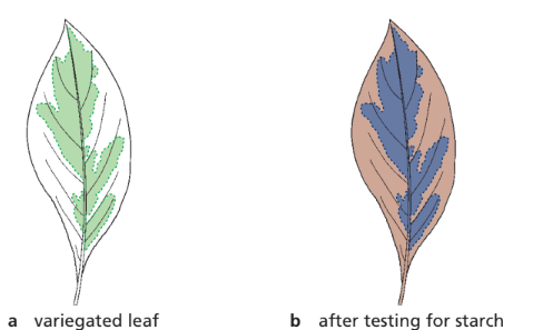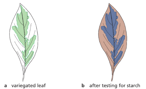 | Evidence | Variegated leaf starch test | Green → starch; White → no starch |