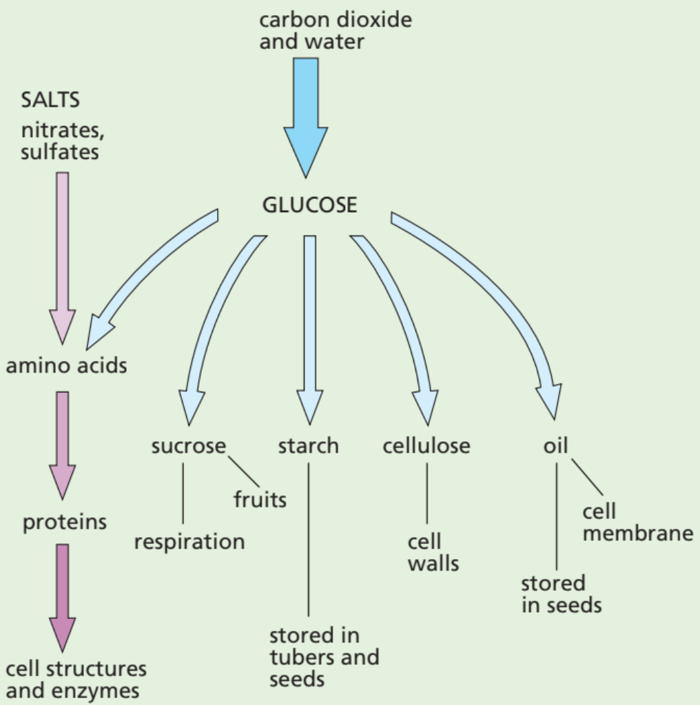 Carbohydrates (mainly glucose) made during photosynthesis are not all stored as glucose. Plants use or convert them into different forms depending on need: energy, growth, structure, transport, or reproduction.