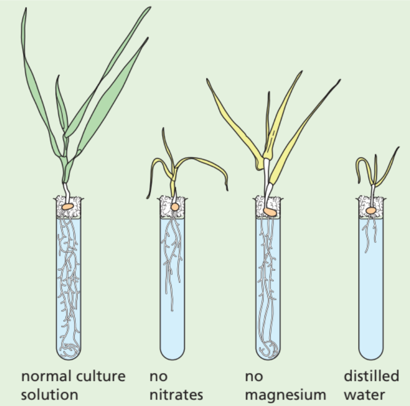 Plants need mineral ions from the soil to make important molecules. Two key ions: nitrate (NO₃⁻) and magnesium (Mg²⁺).
