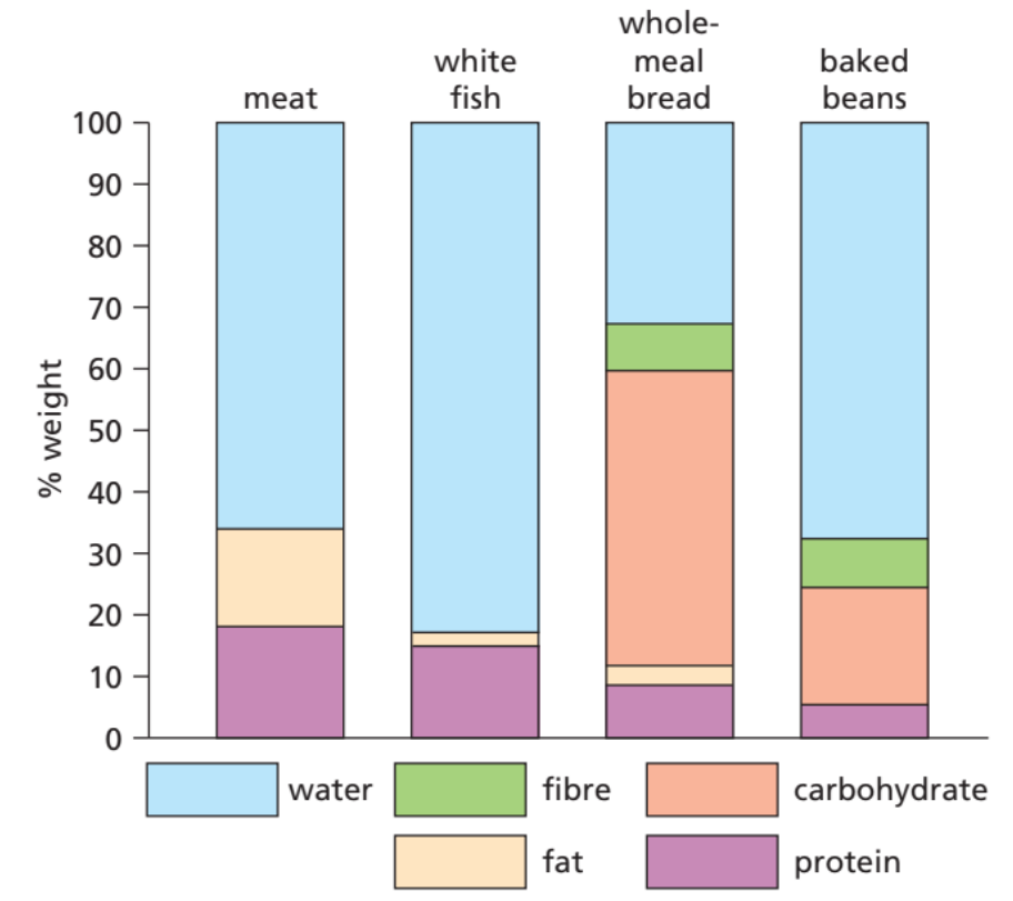 | Fibre | Aids digestion and prevents constipation. | Wholemeal bread, vegetables, fruits |