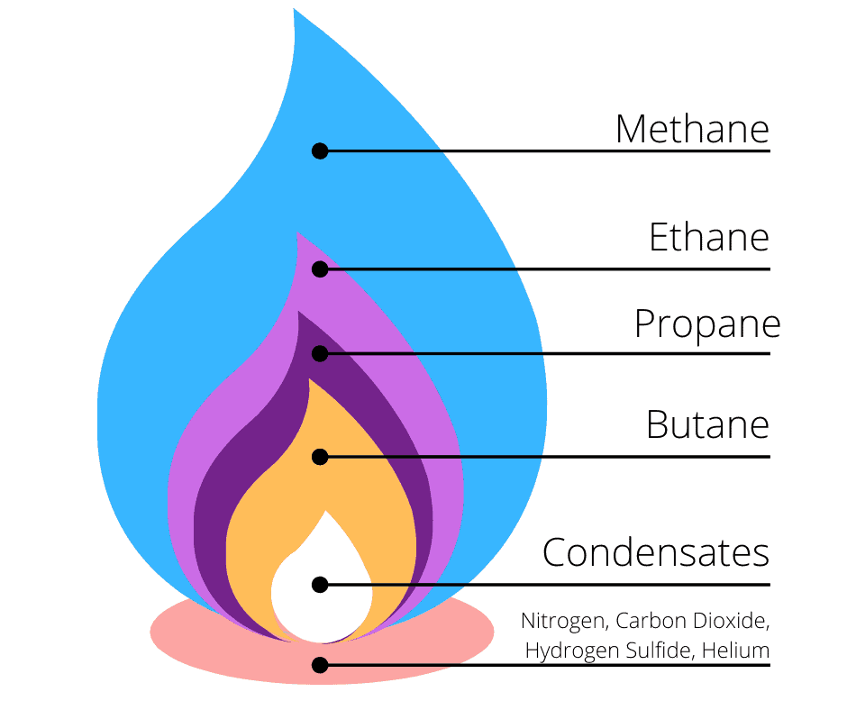 - Other minor components may include ethane (\(\mathrm{C_2H_6}\)), propane (\(\mathrm{C_3H_8}\)), and butane (\(\mathrm{C_4H_{10}}\)).