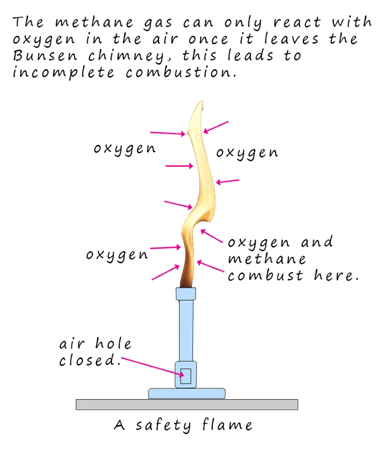 Observation: A yellow, smoky flame is produced due to unburned carbon particles.