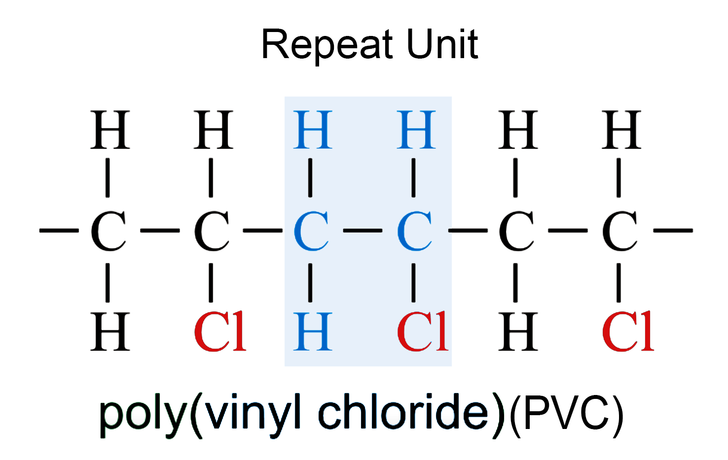 | Chloroethene (\(\mathrm{CH_2=CHCl}\)) | Poly(chloroethene) (PVC) | [–CH₂–CHCl–] |
