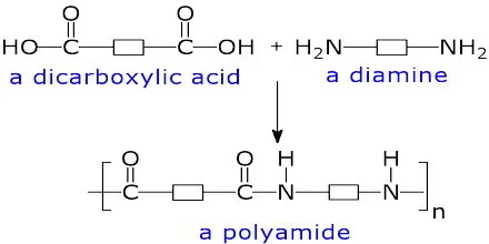 | 1,6-diaminohexane | Hexanedioic acid | Amide (–CONH–) | Water (H₂O) | Nylon-6,6 |