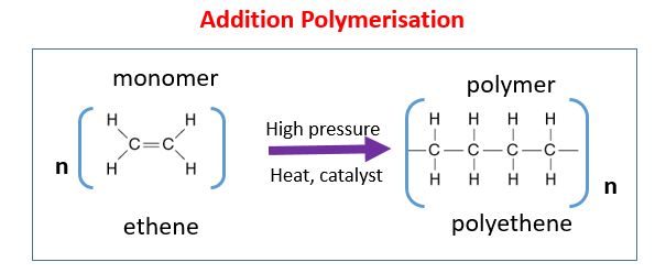 In addition polymerisation, alkenes (like ethene) act as monomers. The double bonds open up and join together, forming a long chain polymer — poly(ethene) — with no other products.