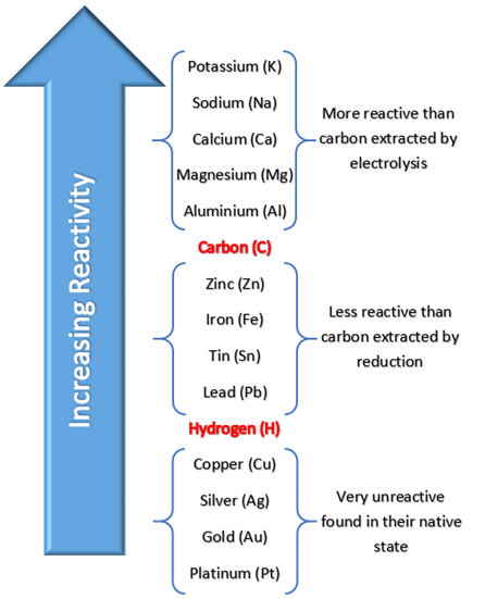 Potassium > Sodium > Calcium > Magnesium > Aluminium > Carbon > Zinc > Iron > Hydrogen > Copper > Silver > Gold