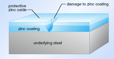 - If the zinc layer is scratched or damaged, exposing the steel, the zinc still protects it.