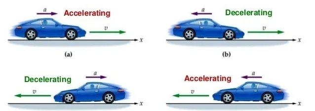 Example: If a bus increases its speed from 0 m/s to 15 m/s in 5 seconds, it is accelerating. If it later reduces its speed from 15 m/s to 5 m/s in 4 seconds, it is decelerating.