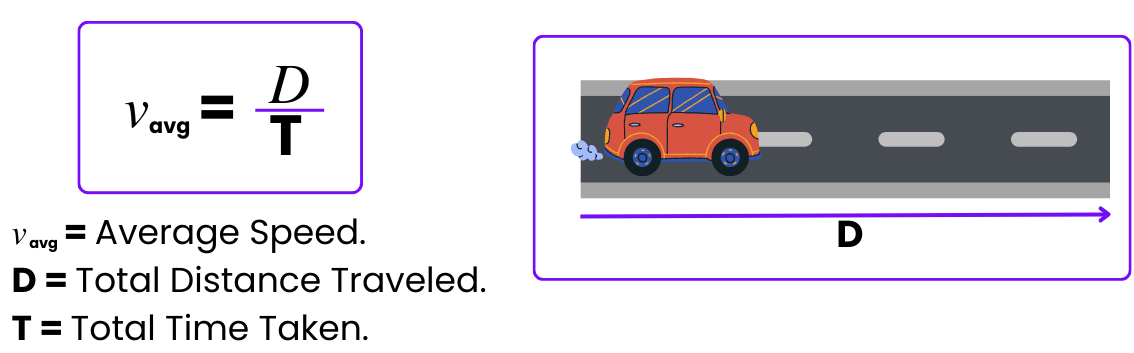 \( \text{Average Speed} = \dfrac{\text{Total Distance}}{\text{Total Time}} \)