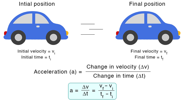 Acceleration is the rate of change of velocity with time. $a = \dfrac{\Delta v}{\Delta t} = \dfrac{v – u}{t} $